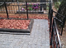 Ограду заменили на новую. Цветник собрали. Оставили зоны для цветов. Заказ сдавали осенью, поэтому решили не сажать цветы в зиму, просто закрыли землю мульчей. Надпись на памятнике освежили, портрет открасили. Очень долго они не потребуют к себе внимания по ремонту. На пол положили брусчатку. По периметру проварили металлическую полосу, с годами брусчатка не разъедется. Подробный фотоотчет ниже.